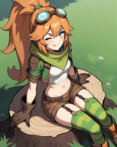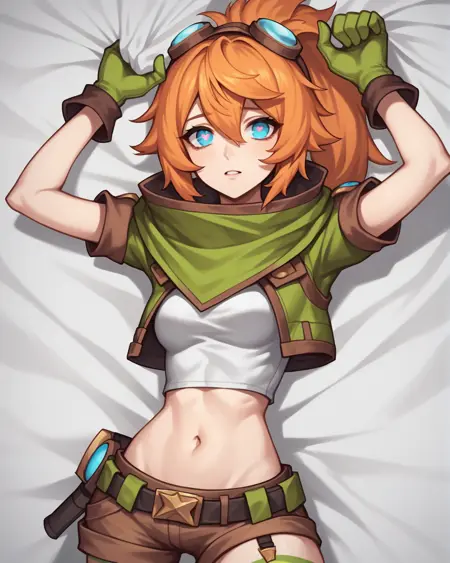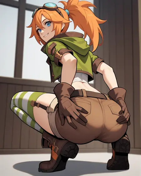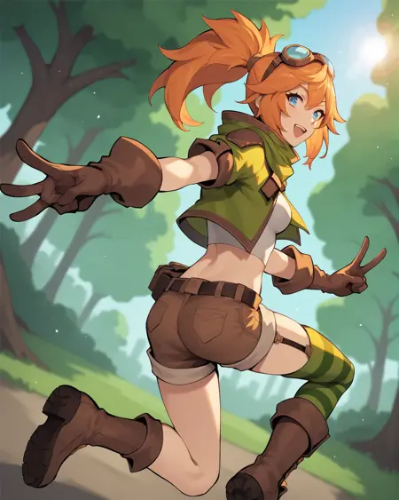 基本上,你用“LucieBR,高马尾,蓝眼睛,橙色头发”来描述外观,用“头戴护目镜,棕色短裤,手套,短款夹克,绿色夹克,短袖,条纹长筒袜,绿色长筒袜,肚脐,白色露脐上衣,绿色围巾,超短裤,不对称腿饰,单条吊袜带,系带靴,棕色靴子”来描述默认服装。