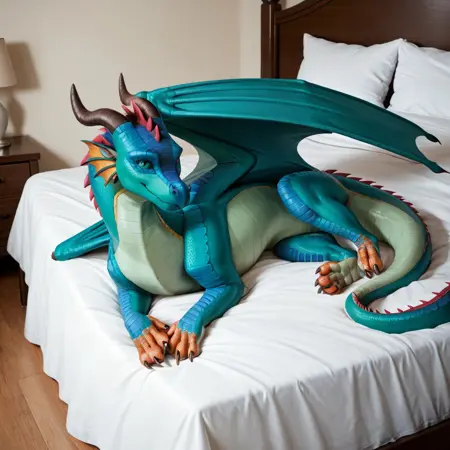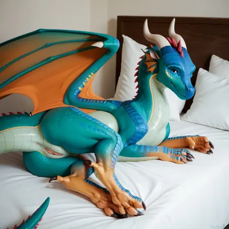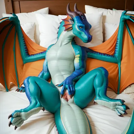 附加提示词:dragon, ear ruffs, head fins, scales, horn, claws, wings, tail