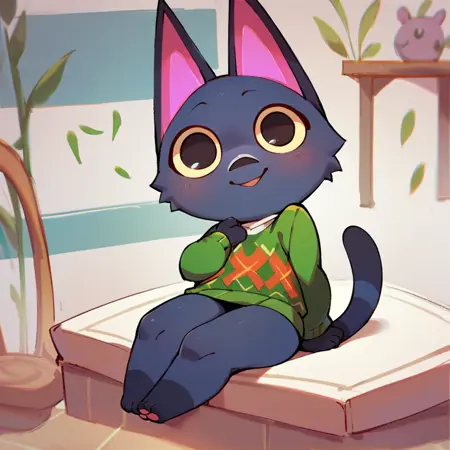 来自《动物森友会》的Kiki!如果你想还原她经典的装扮,可以使用类似菱形图案衣服、菱形图案毛衣或菱形图案背心的描述。不过她很可能是无下身的,因此如果你想确保内容安全,请在提示中添加“无生殖器”之类的标签。