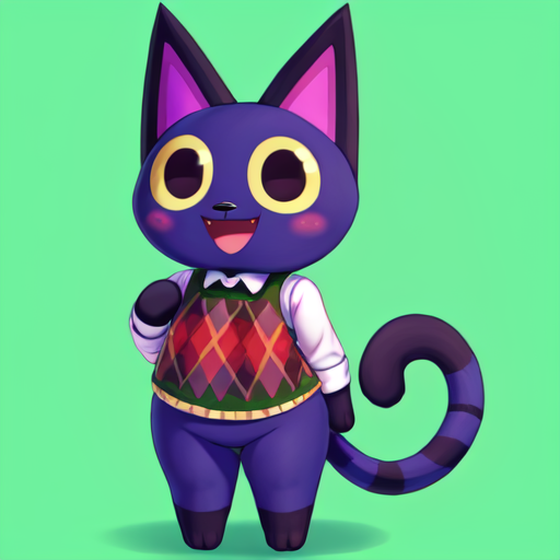 来自《动物森友会》的Kiki!如果你想还原她经典的装扮,可以使用类似菱形图案衣服、菱形图案毛衣或菱形图案背心的描述。不过她很可能是无下身的,因此如果你想确保内容安全,请在提示中添加“无生殖器”之类的标签。