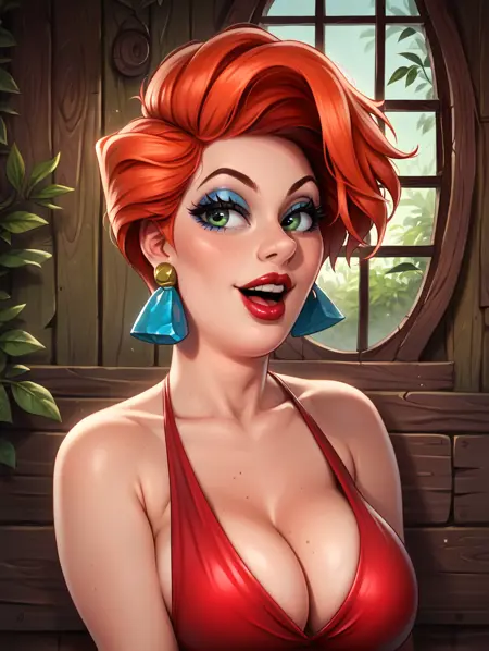 madame medusa,green eyes,vibrant red hair,short hair,swept back hair,
