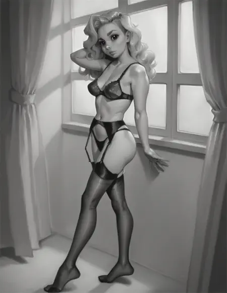 두꺼운 윤곽선 - 이는 그녀의 주요 Jab Comix 스타일로, 그림자가 더 많고 피부가 더 반짝이며 분필처럼 강화된 윤곽선을 갖고 속눈썹 디테일은 적다.
