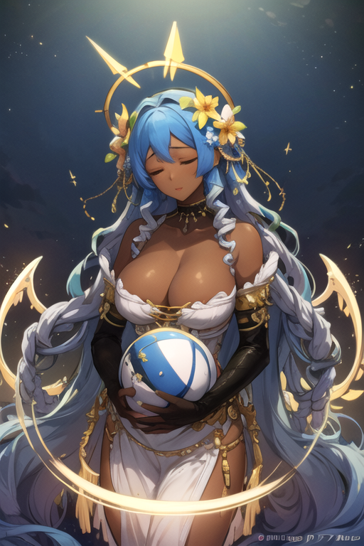 EarthGoddessMaiaYs, 1girl, solo, very long hair, large breasts, hair ornament, cleavage, blue hair, closed eyes, hair flower, dark skin, dark-skinned female, halo, blue lips