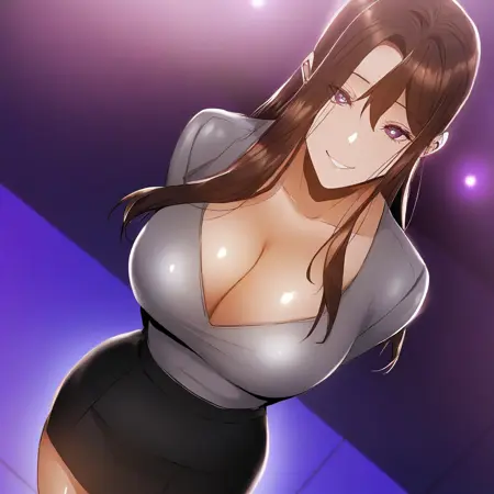 ((섹시한 회색 상의, 저속한 가슴선, 거대한 가슴선, 섹시한 검은 펜실 치마, )) 흰색 럭셔리 가방,
