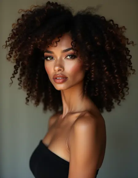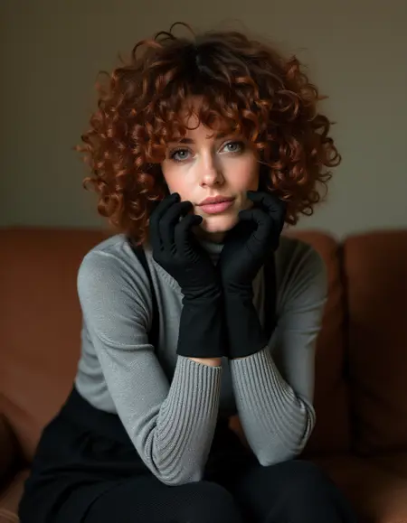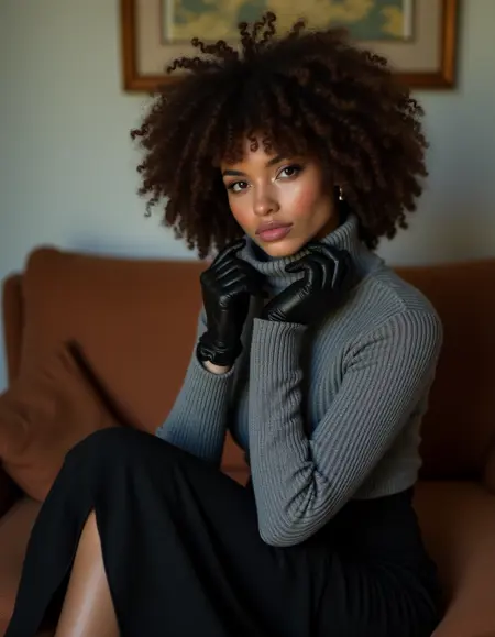 该AI模型生成一位卷发女孩的图像,她穿着舒适而时尚的保暖服装,非常适合寒冷的日子。她身着黑色针织羊毛衣物,可能包括一件高领 oversized 毛衣、长裙或开衫,传递出舒适与优雅的感觉。女孩还穿着保暖长筒袜和针织手套,突出材料的纹理与体积感。该模型专注于时尚元素的细节,如面料纹理、身体曲线和富有表现力的姿态,以展现冬季服装的美学与功能性。