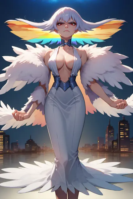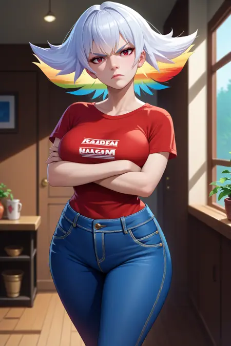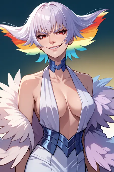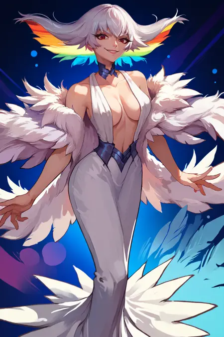 トリガー単語は「ragyou」であり、「白髪、虹色の髪、多色の髪、短髪、赤い目、成熟した女性」は必須です。