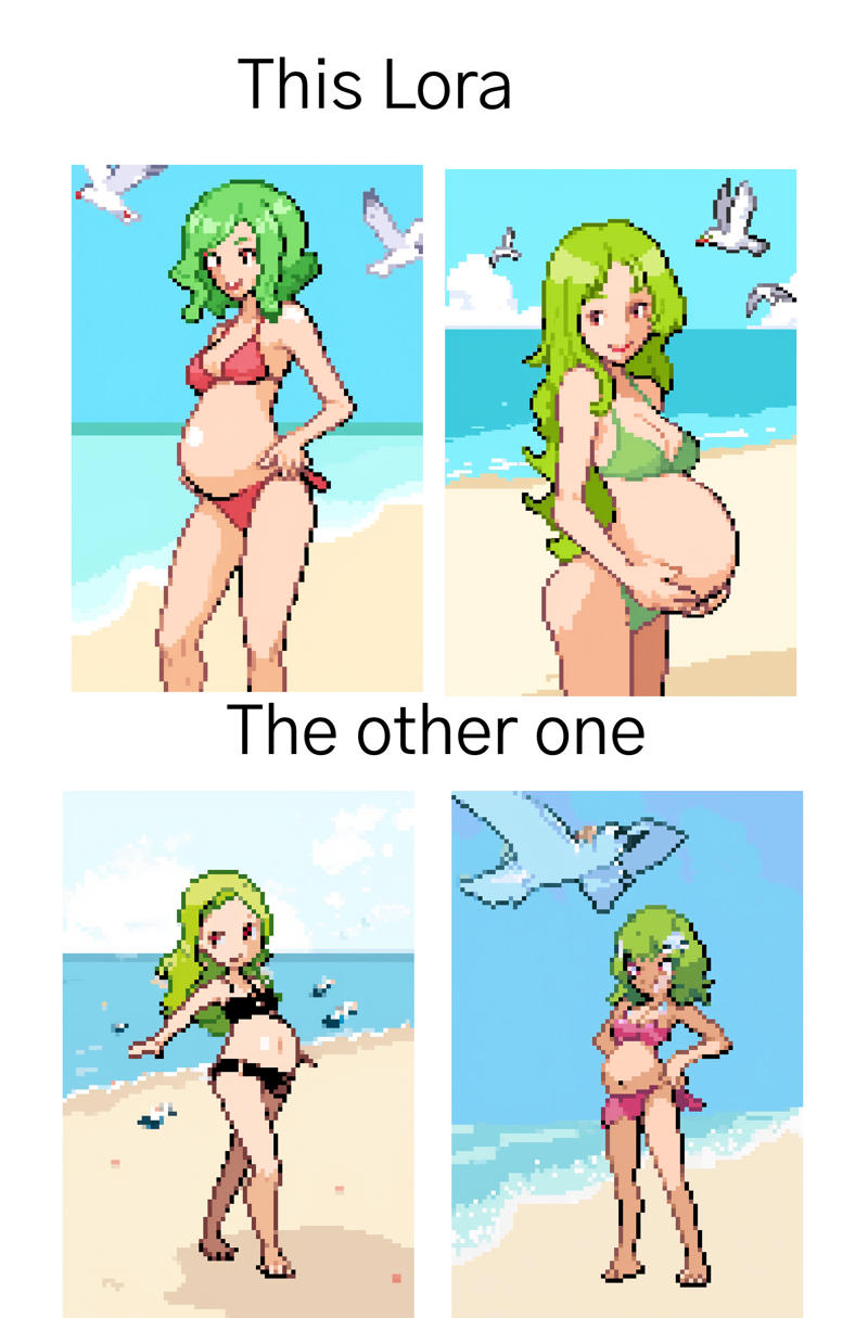Prompt: A pixelart drawing of A pregnant woman wearing a bikini at the beach with green wavy hair and red eyes, seagulls in the sky.