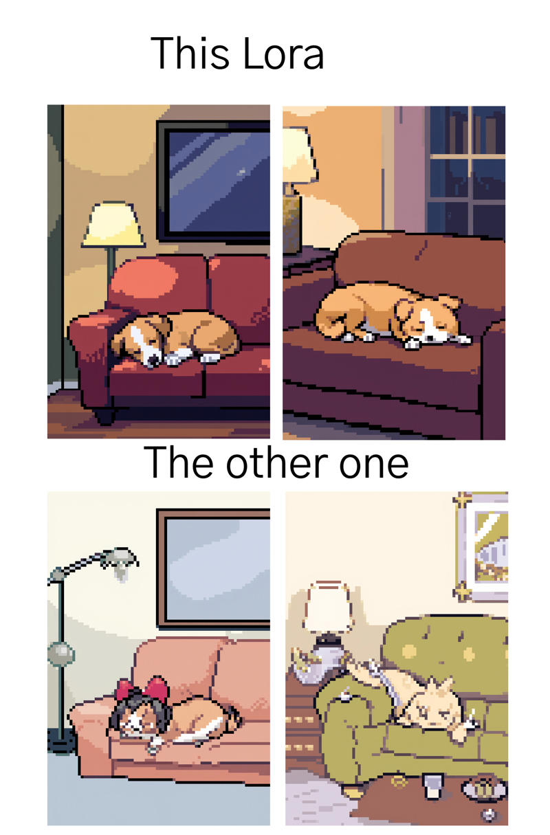 As expected this lora's weight norms are lower, which means it is slightly more flexible, at the cost of not being as consistent with pixels.