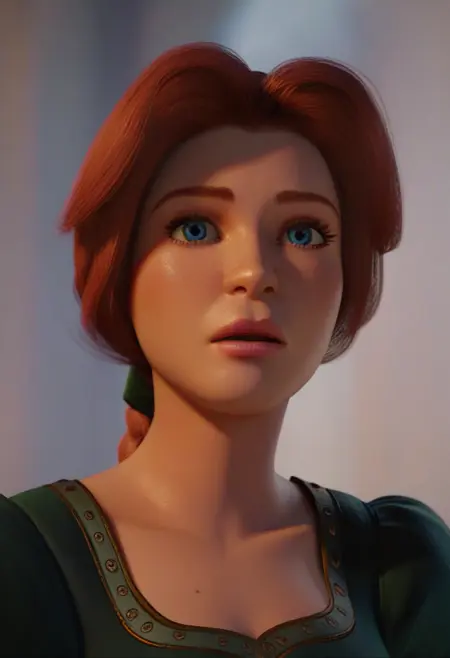 princess fiona, blue eyes, freckles, mole, pink lipstick, red hair, long hair, braided ponytail, crown, shrek 1 dress, green dress, long sleeves, Green shoes
