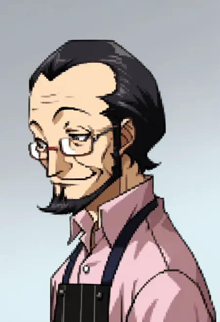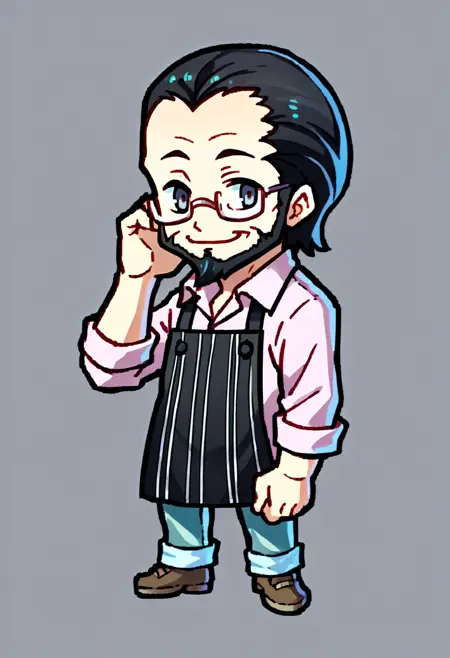 标签为“短发、黑发、胡须、灰眼睛、眼镜、有领衬衫、粉红色衬衫、围裙、长裤”