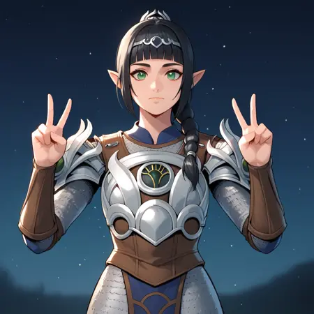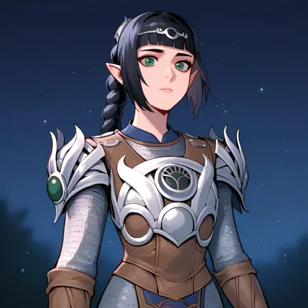 1girl, solo, ShadowHeart, black hair, blunt bangs, braided ponytail, green eyes, pointy ears,