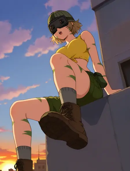 hat, mask, yellow shirt, backpack, black gloves, green shorts, green markings