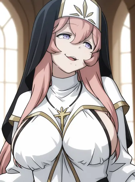 衣装:white_long_dress、Lilynette_Piani、sideboob、nun、habit、dress_with_black_edging、black_veil、cross_necklace、capelet_with_pelvic_curtain、white_capelet、capelet_with_gold_edging、long_sleeves、black_fingerless_gloves、black_belt、v_belt、side_slit、black_fishnet_legwear、white_black_footwear、high_heels、knee_boots