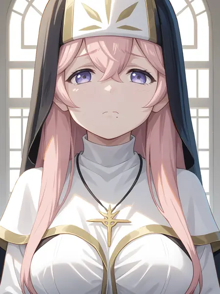 衣装:white_long_dress、Lilynette_Piani、sideboob、nun、habit、dress_with_black_edging、black_veil、cross_necklace、capelet_with_pelvic_curtain、white_capelet、capelet_with_gold_edging、long_sleeves、black_fingerless_gloves、black_belt、v_belt、side_slit、black_fishnet_legwear、white_black_footwear、high_heels、knee_boots