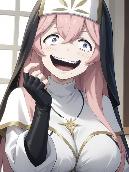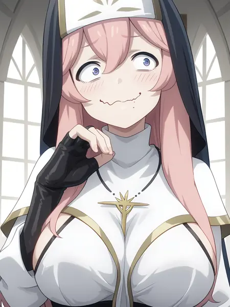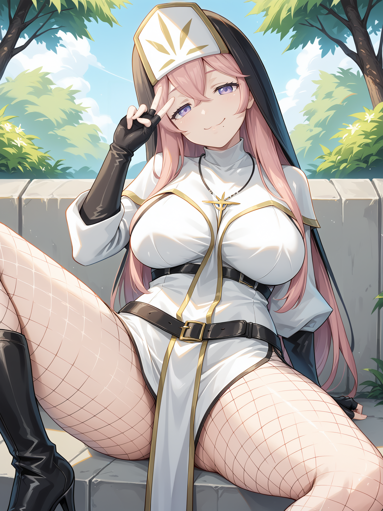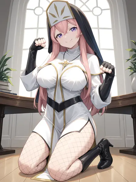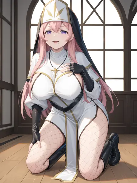 服饰:white_long_dress, Lilynette_Piani, sideboob, nun, habit, dress_with_black_edging, black_veil, cross_necklace, capelet_with_pelvic_curtain, white_capelet, capelet_with_gold_edging, long_sleeves, black_fingerless_gloves, black_belt, v_belt, side_slit, black_fishnet_legwear, white_black_footwear, high_heels, knee_boots