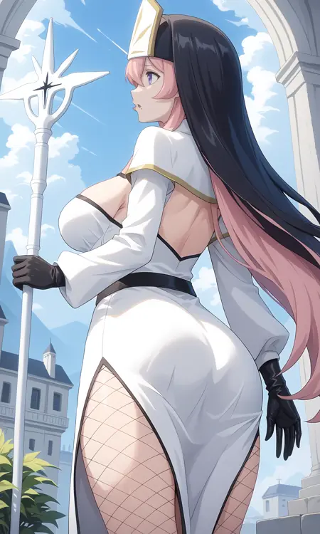 服饰:nun, habit, black_veil, cross_necklace, sideboob, long_sleeves, black_gloves, fingerless_gloves, white_dress, gold_trim, black_trim, long_dress, fishnet_pantyhose, see-through_legwear, black_footwear, knee_boots, high_heels, holding_staff