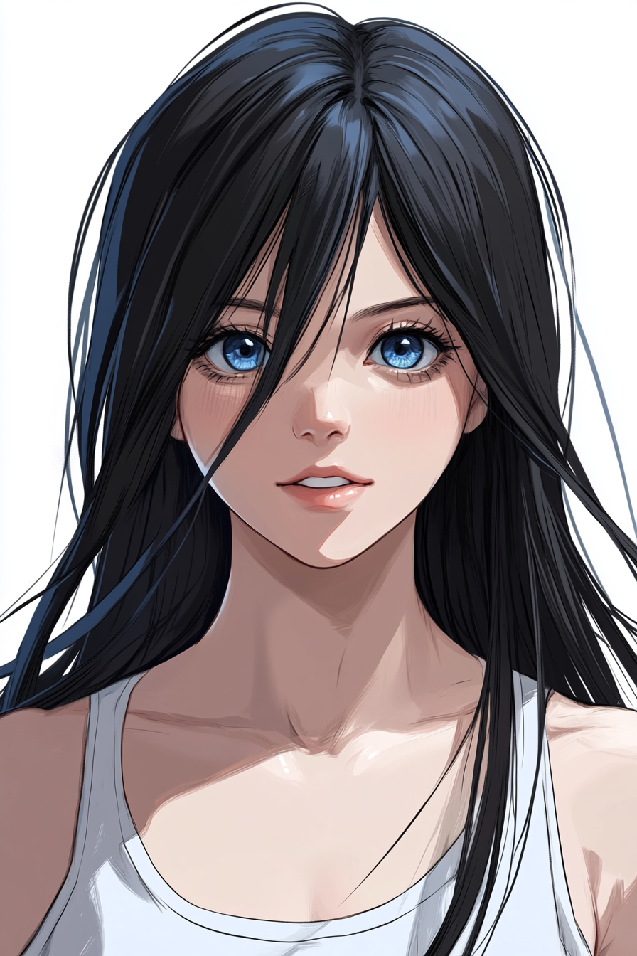 Arnikamb, 검은 머리카락, 긴 머리카락, 파란 눈, 눈 사이의 머리카락