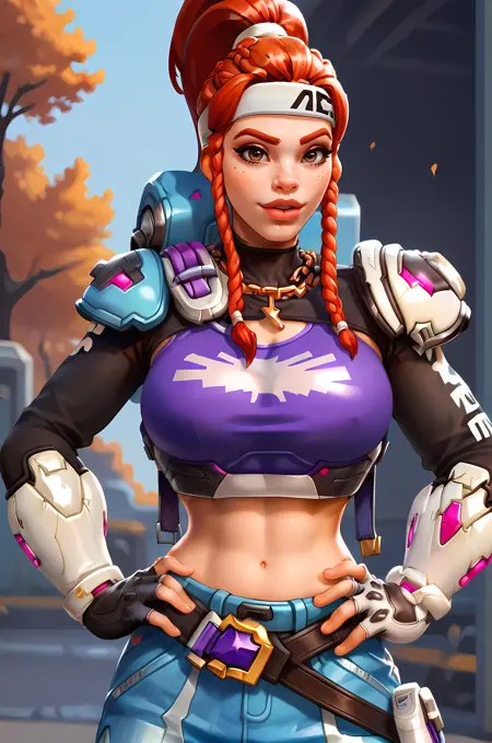 le sserafim brigitte, overwatch brigitte, red hair, high ponytail, braided bangs, brown eyes, white headband, purple crop top, black long-sleeved undershirt, belt, blue utility pants, knee pads, fingerless gloves