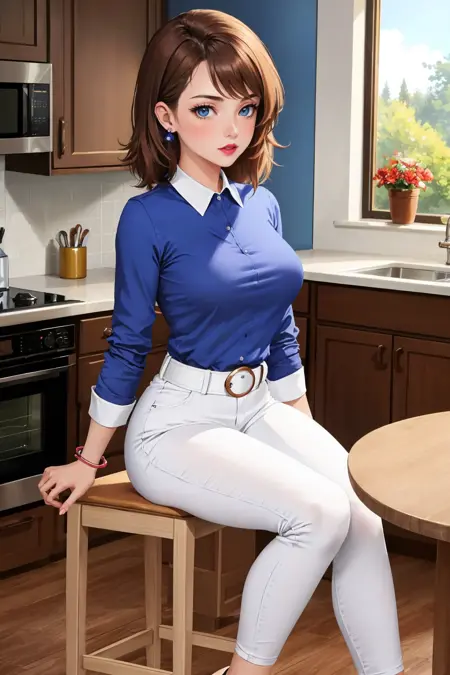 Outfit Tags: earrings, lipstick, blue shirt, bracelet, white pants, belt