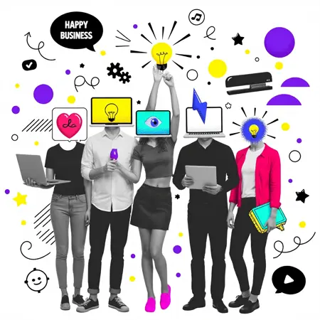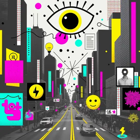 “一场梦幻般的都市街景,当代拼贴艺术风格,建筑由报纸剪报构成,人物头部被霓虹灯牌取代,天空中漂浮着数字云朵与几何形状。”