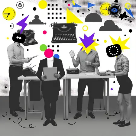 分层描述:为充分展现拼贴风格,应在场景中描述多个层次与元素。例如:“一个混乱的创意工作空间,当代拼贴艺术风格,包含散落的画具、漂浮的涂鸦和著名画作的杂志剪报。”