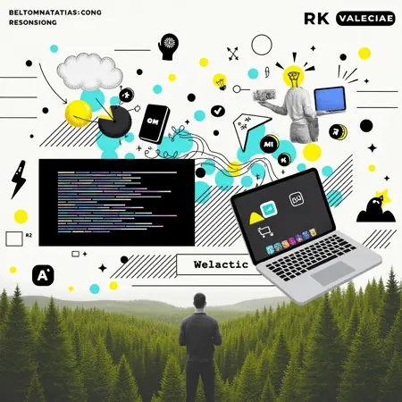 “一种混合景观,当代拼贴艺术风格,将宁静森林与数字故障效果、漂浮的电脑部件和手绘元素结合,营造出自然与科技之间的强烈对比。”