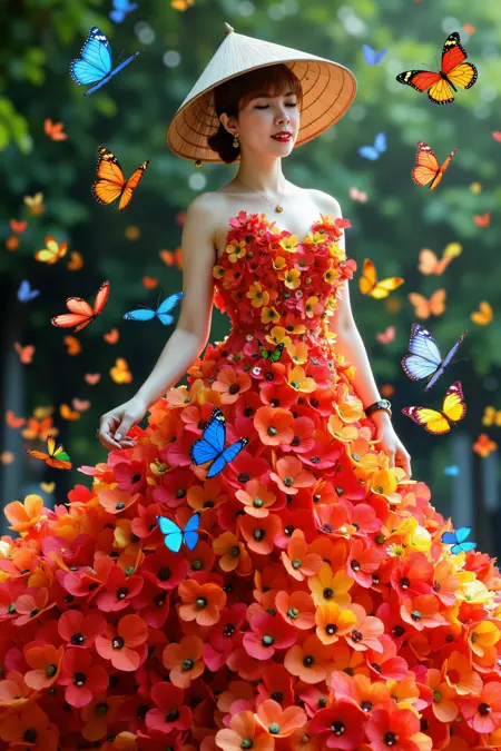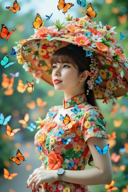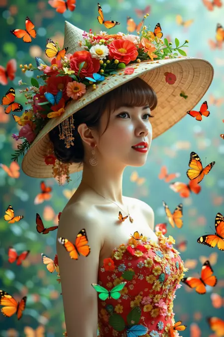 "A stunningly beautiful woman in traditional Vietnamese attire (ao dai) stands gracefully amidst a swarm of vibrant, colorful butterflies. She wears a large, intricately adorned hat made of flowers and foliage that cascades down her back, blending seamlessly into her dress, which is covered in similar floral decorations. The butterflies, in various shades of orange, red, blue, and green, flutter around her, enhancing the dreamlike, ethereal atmosphere. The overall scene is filled with a sense of natural beauty and elegance, with a soft focus that highlights the delicate details of the flowers and the woman's serene expression."