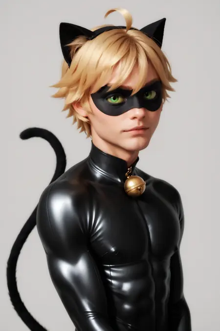트리거: imtdchatnoir, 1boy, male, blonde hair, animal ears, mask, cat ears, cat boy, bodysuit, bell, green sclera, green eyes, black bodysuit, domino mask, tail, cat tail, fake animal ears, ahoge, skin tight