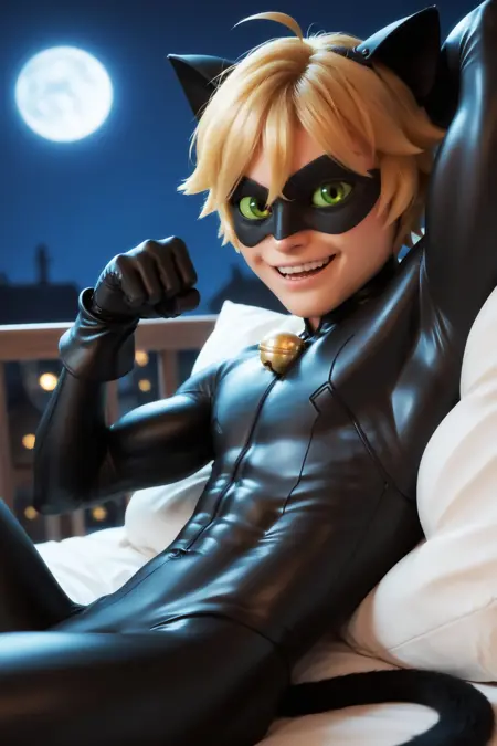 提示词:1boy, male, blonde hair, animal ears, mask, cat ears, cat boy, bodysuit, bell, green sclera, green eyes, black bodysuit, domino mask, tail, cat tail, fake animal ears, ahoge, skin tight