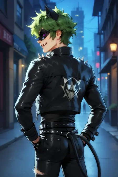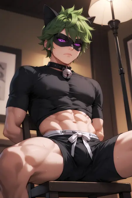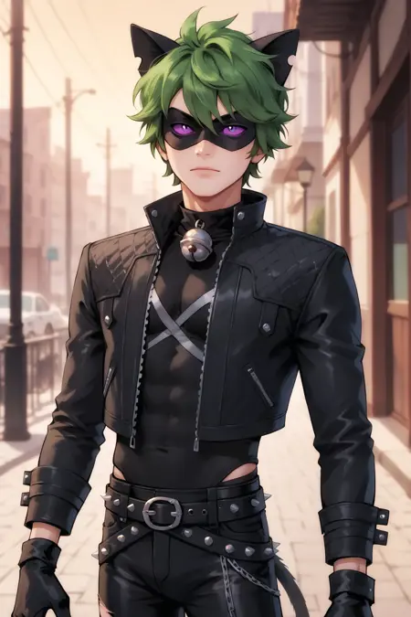 트리거: imtdchatnoir, 1boy, male, blonde hair, animal ears, mask, cat ears, cat boy, bodysuit, bell, green sclera, green eyes, black bodysuit, domino mask, tail, cat tail, fake animal ears, ahoge, skin tight