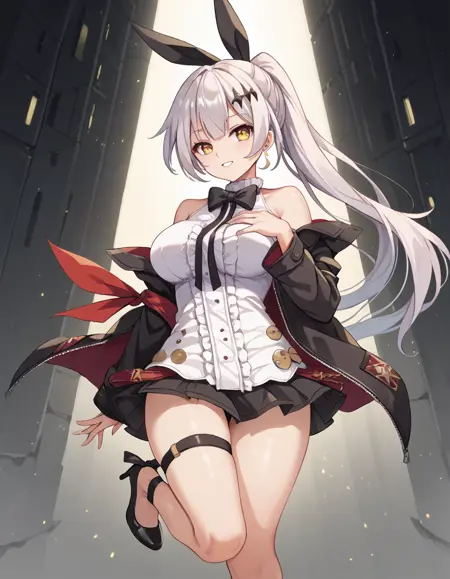 57def, def无袖上衣, 白色上衣, def夹克, 开襟夹克, 长袖, def臂带, def迷你裙, def大腿绑带, 单侧大腿绑带, def腿带, def高跟鞋