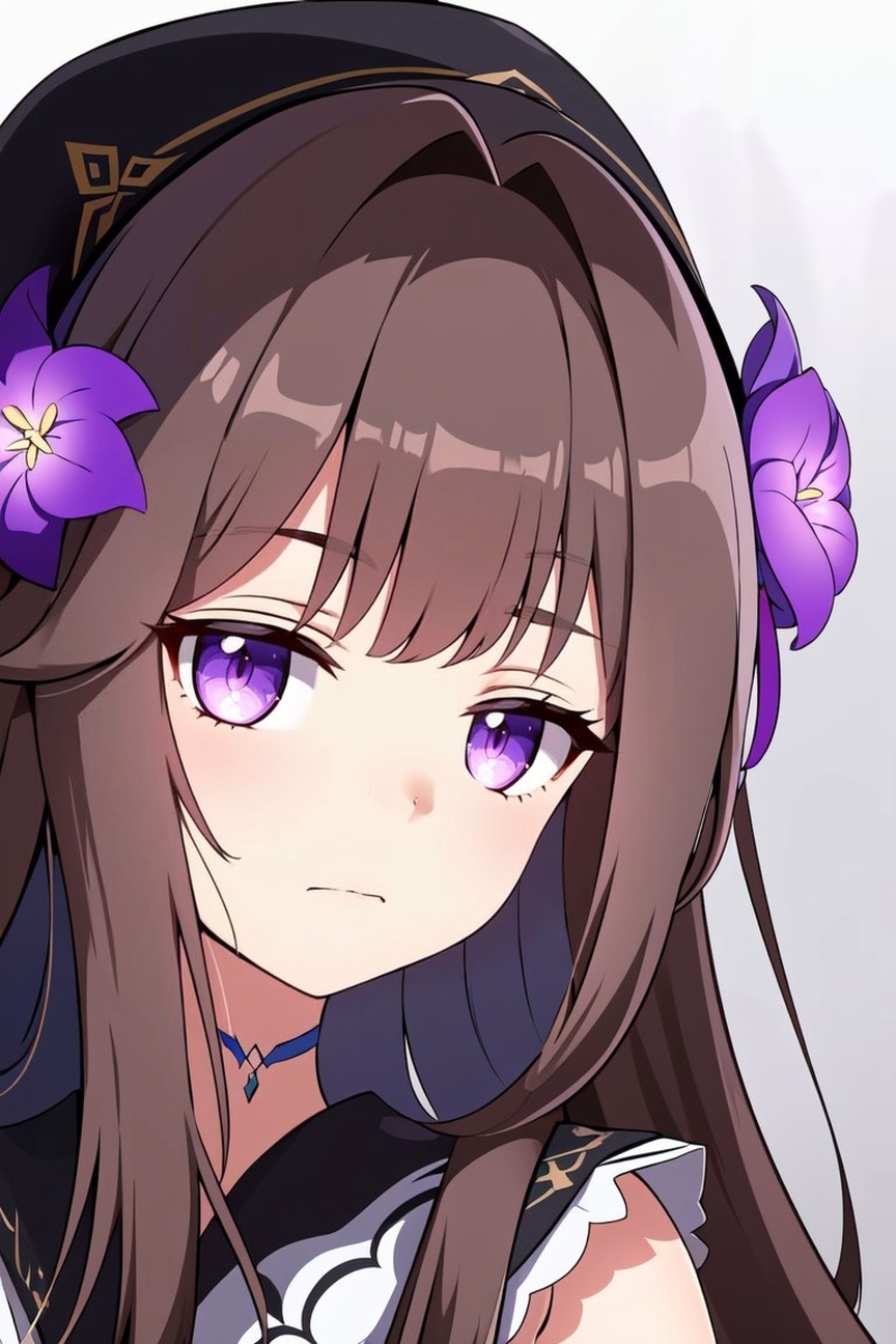 要召唤她,请使用触发标签,并加上以下标签:pikkyherta, 1girl, long hair, purple eyes, solo, hat, dress, bangs, looking at viewer, flower, doll joints, brown hair, hair ornament, black headwear, hair flower