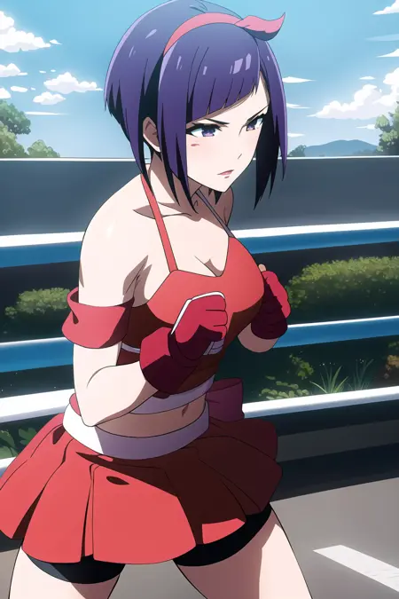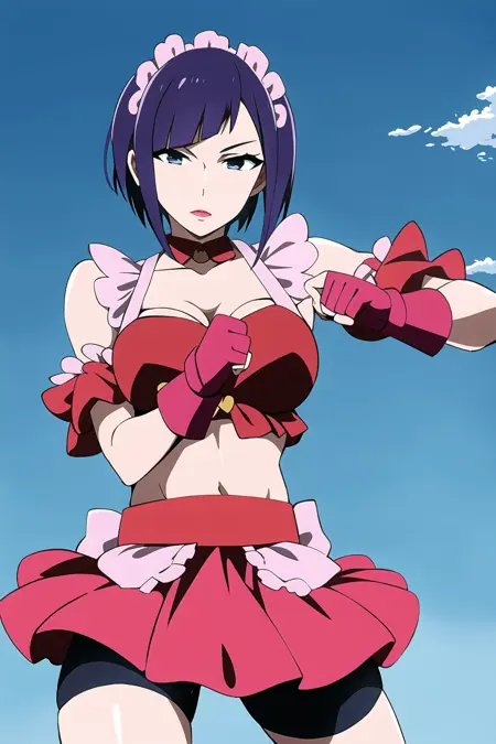 用于女仆战斗造型:rankowz, 红色无指手套, 自行车短裤, 肚脐, 红色手套, 裸露胸部, 红色裙子, (发夹:1.1), 短发, 紫发, 紫色眼睛, 裙子下短裤, 红唇, 腰部围裙, 红色胸罩