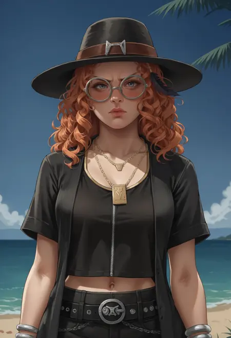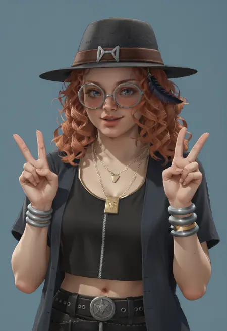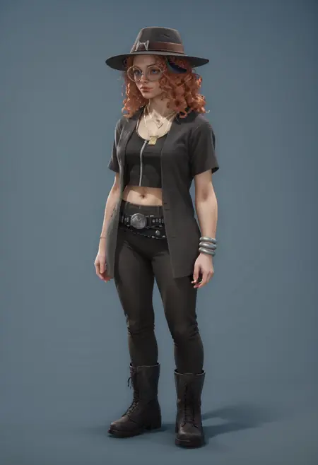 • hat, jewelry, glasses, round eyewear, necklace, shirt, belt, bracelet, pants, black pants, boots, black footwear