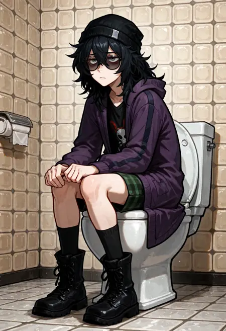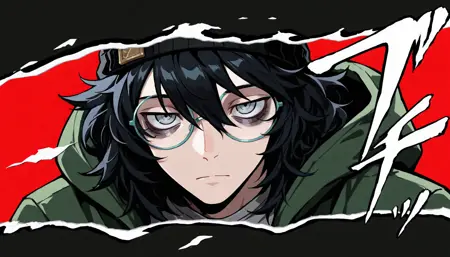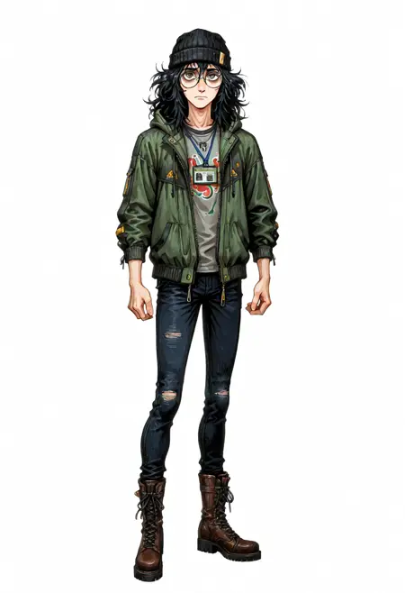 Additional triggers: medium hair, black hair, messy hair, grey eyes, bags under eyes (for head), black beanie, round glasses, grey shirt, print shirt, green jacket, hooded jacket, hood down, black gloves, fingerless gloves, cross-laced footwear (his usual clothes)