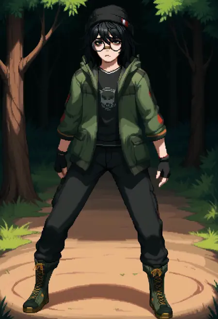 추가 트리거: 중간 길이 머리카락, 검은 머리카락, 어수선한 머리카락, 회색 눈, 눈 아래 다크서클 (머리 부분), 검은 비니, 동그라미 안경, 회색 셔츠, 프린트 셔츠, 녹색 재킷, 후드 재킷, 후드 내린 상태, 검은 장갑, 지문 없는 장갑, 십자 끈 신발 (그의 일반적인 옷차림)