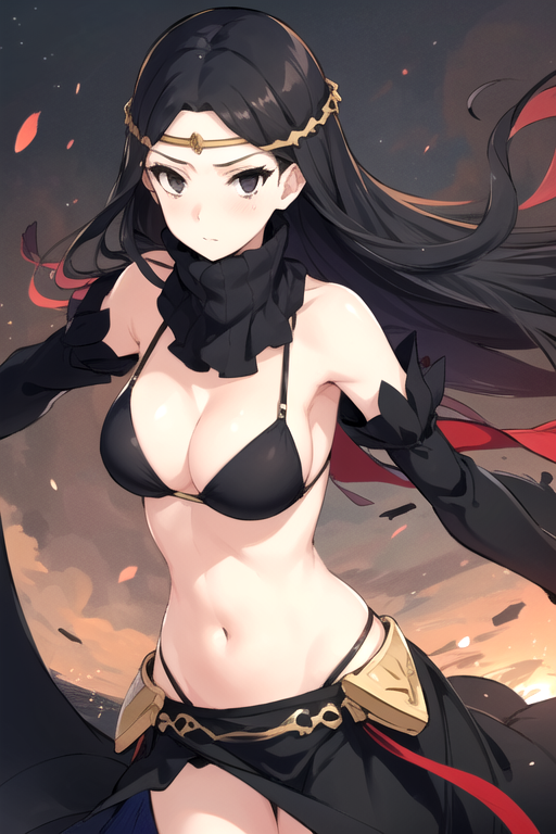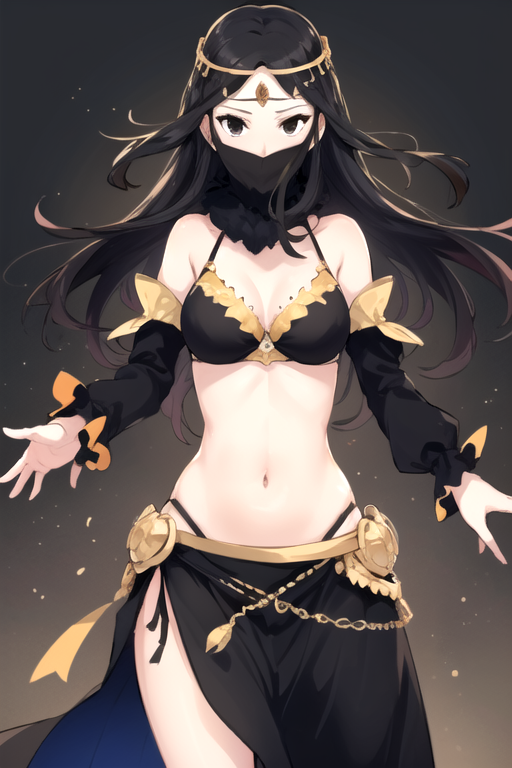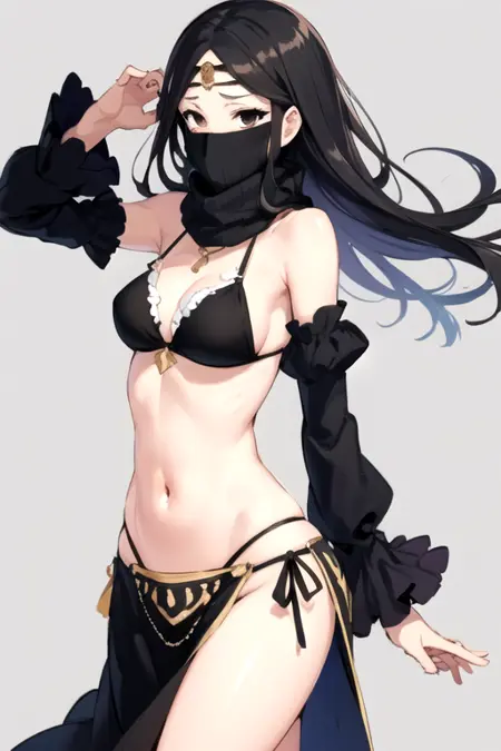 ZubaidaSoulEater, 1girl, solo, long hair, black skirt, black hair, navel, bare shoulders, detached sleeves, midriff, black eyes, veil, black bikini ,bikini top only, pelvic curtain, circlet