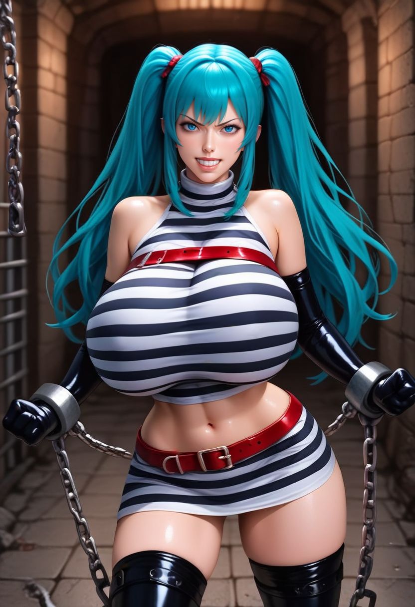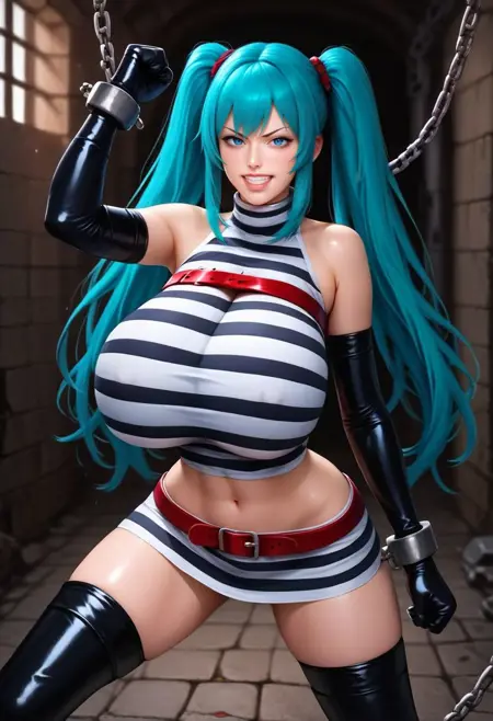 prison shirt, turtleneck, bare shoulders, elbow gloves, bondage, red chest strap, manacles, shackles, broken chain, red loose belt, prison skirt,