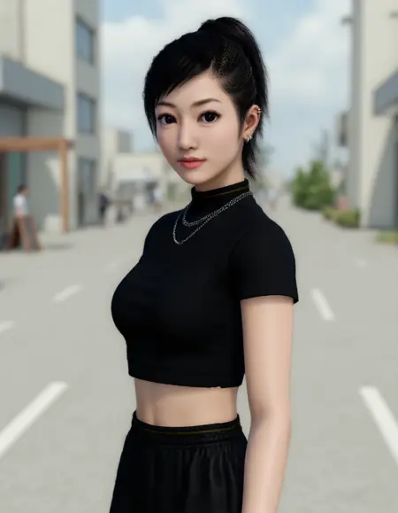 For her default outfit, use black short-sleeved crop top, black sweatpants and grey sneakers.