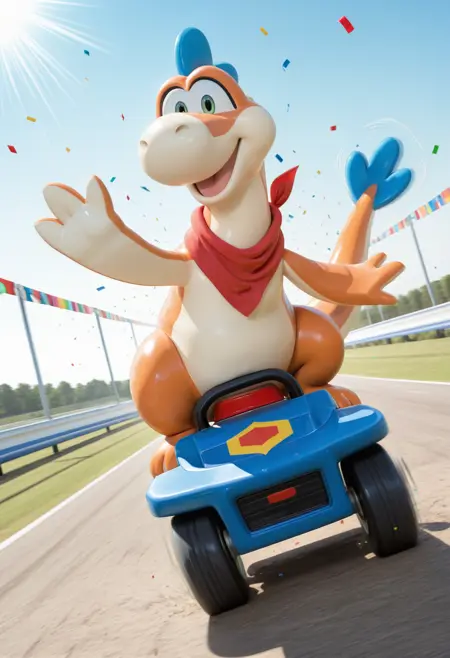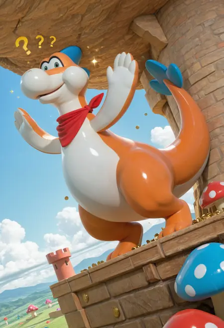 📝 Плесси — большой дружелюбный динозавр из Super Mario 3D World и Bowser’s Fury. Он перевозит героев по уровням, похож на До́рри. У него оранжевое тело, белая морда с ноздрями, красный платок на шее, синие плавники и хвост с тремя голубыми лопастями, а на спине четыре тёмные полосы。