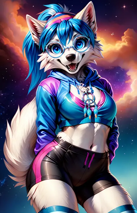 peacewolfblue, blue-framed eyewear, headband, hair tie, high ponytail, blue fringe, multicolored hair, antho, wolf tail
