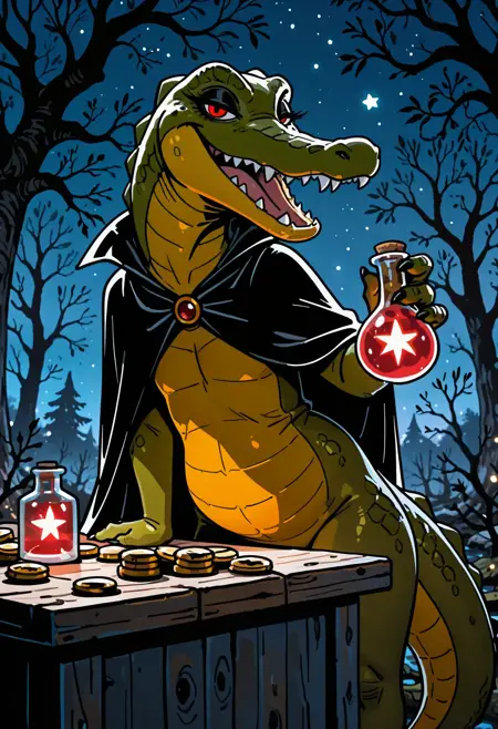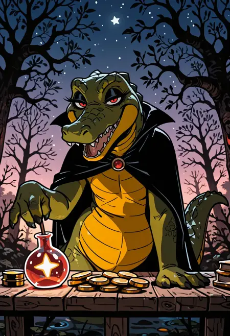 gatorC、アリゲーター、男性、緑色の肌、黄色い腹部、オレンジ色の目、太っており、悪意ある、尾、(short:1.2)、(feral:0.8)、無表情な胸、