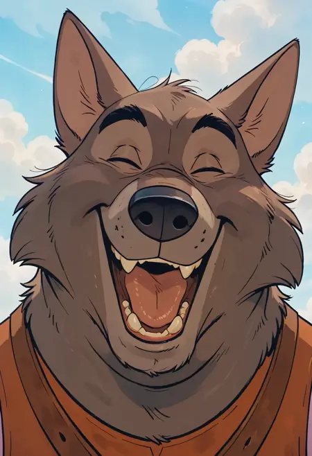 sheriffC、オオカミ、男性、シャーリフ、茶色の毛皮、黒い目、黒い鼻、膨らんだ鼻、太っており、醜い、尾、