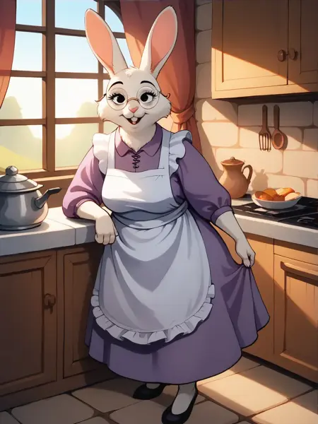 bunny mom,兔子,女性,白色皮毛,黑色眼睛,粉红色鼻子,白色耳朵,耳朵向后,丰满,成熟女性,成熟,