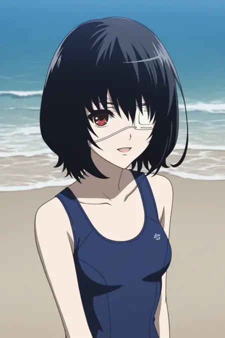 mei misaki, 단발, 검은 머리, 빨간 눈, 안대, misakiswim, 파란 수영복, 대회용 학교 수영복