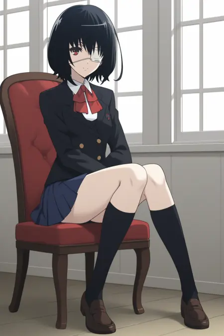 mei misaki, 단발, 검은 머리, 빨간 눈, 안대, misakischoolwin, 학교 복장, 블레이저, 긴 소매, 검은 재킷, 흰 셔츠, 칼라 셔츠, 빨간 넥커치프, 학교 문양, 파란 치마, 주름 치마, 검은 무릎높이 양말, 로퍼