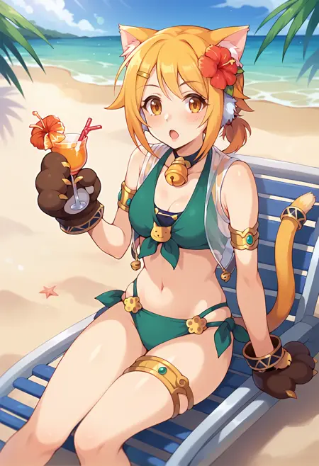 - pcrhiyo, 고양이 귀, 동물 귀 털, 고양이 꼬리, hiyo3s, 헤어클립, 귀 피어싱, 털 장식 목걸이, 목 벨, 어깨 노출, 가슴 노출, 팔찌, 노란 조끼, 열린 조끼, 허리 노출, 벨트, 버클, 노란 반바지, 하이레그, 녹색 비키니, 털 장식 장갑, 발톱 장갑, 꼬리 링, 털 부츠, 갈색 부츠,