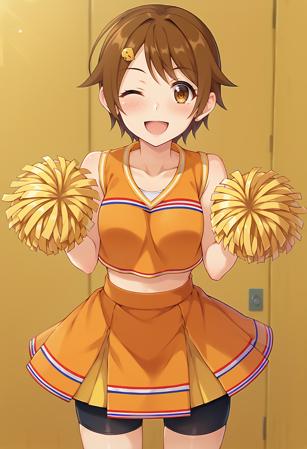 - rlhiyo, 갈색 머리, 헤어클립, 응원단, 크롭탑, 소매 없음, 바이크 반바지, 펌퐁 (응원) , 주황색 치마,