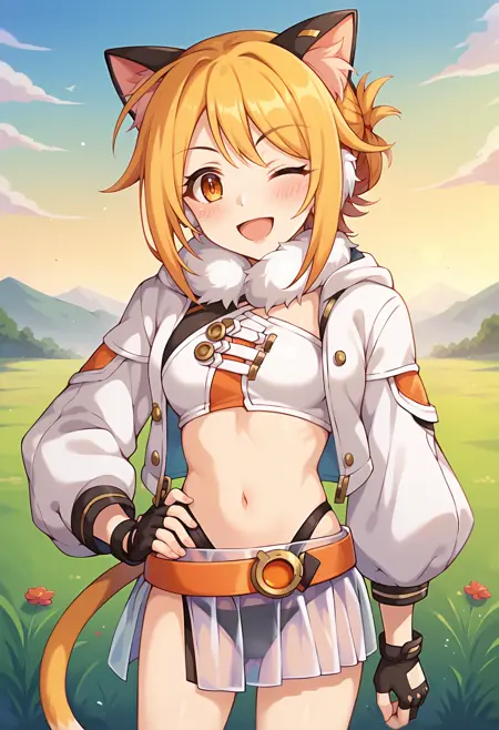- pcrhiyo, 고양이 귀, 동물 귀 털, 고양이 꼬리, hiyoas, 접힌 말머리, 털 장식 목걸이, 흰색 재킷, 열린 재킷, 흰색 크롭탑, 주황색 벨트, 검은 팬티, 하이레그, 흰색 치마, 투명 치마, 손가락 없는 장갑, 흰색 부츠, 무기,