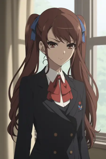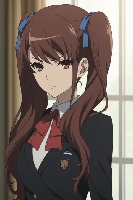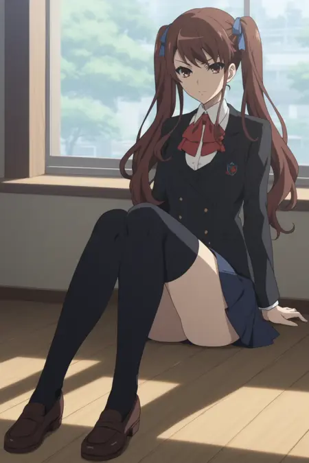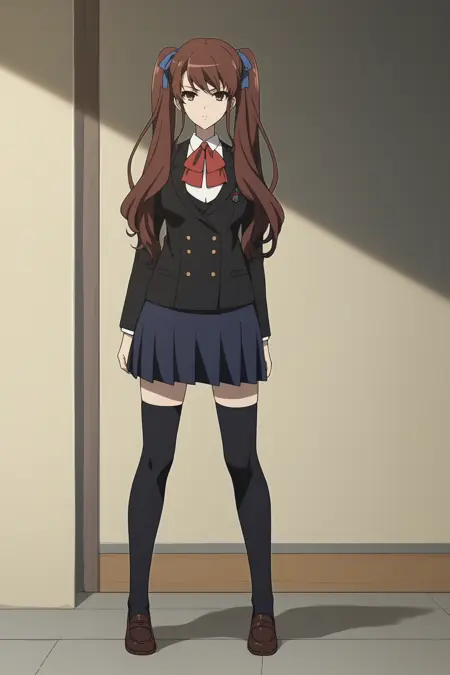akazawa izumi, 棕色头发, 长发, 双马尾, 蓝色发带, 棕色眼睛, akazawaschoolwin, 校服, 西装外套, 长袖, 黑色夹克, 白色衬衫, 有领衬衫, 红色领巾, 学校徽章, 蓝色裙子, 百褶裙, 黑色过膝袜, 乐福鞋